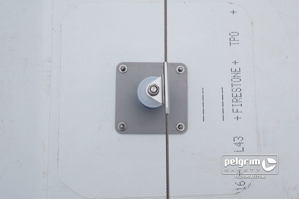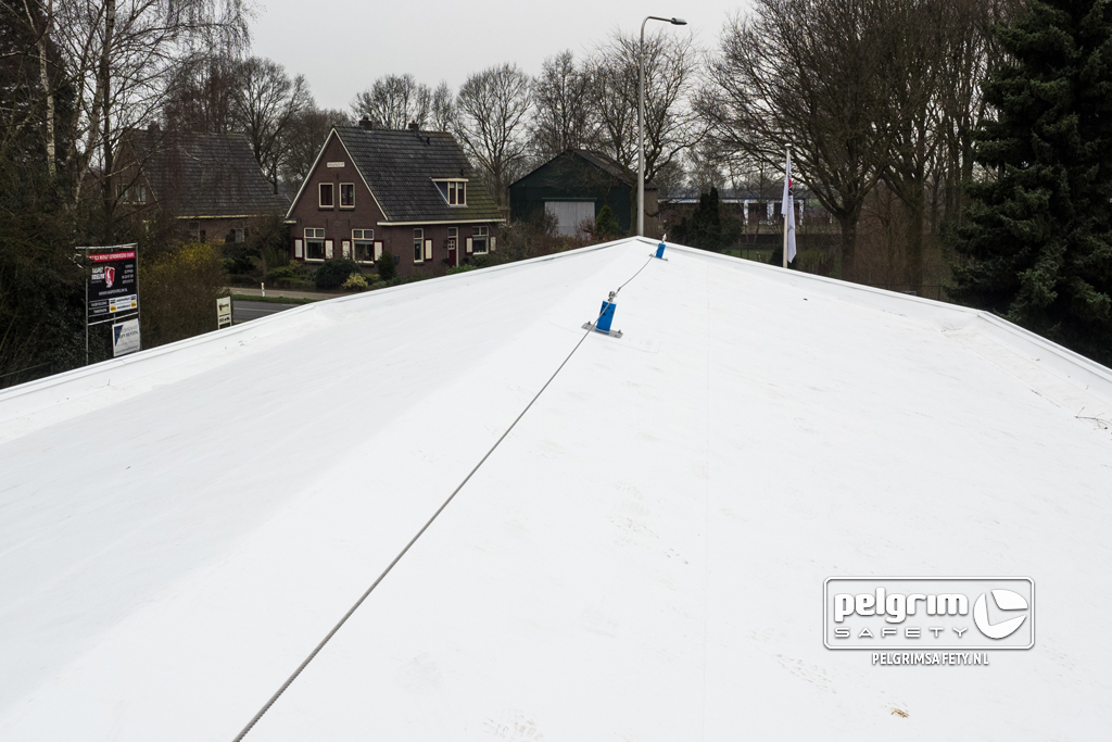 • Er is gekozen voor een SafeLine doorloopbaar lijnsysteem conform EN795C met SafeLock EN795A anti pendule ankerpunten op de hoeken. Er mag met 3 personen tegelijk aan gewerkt worden.