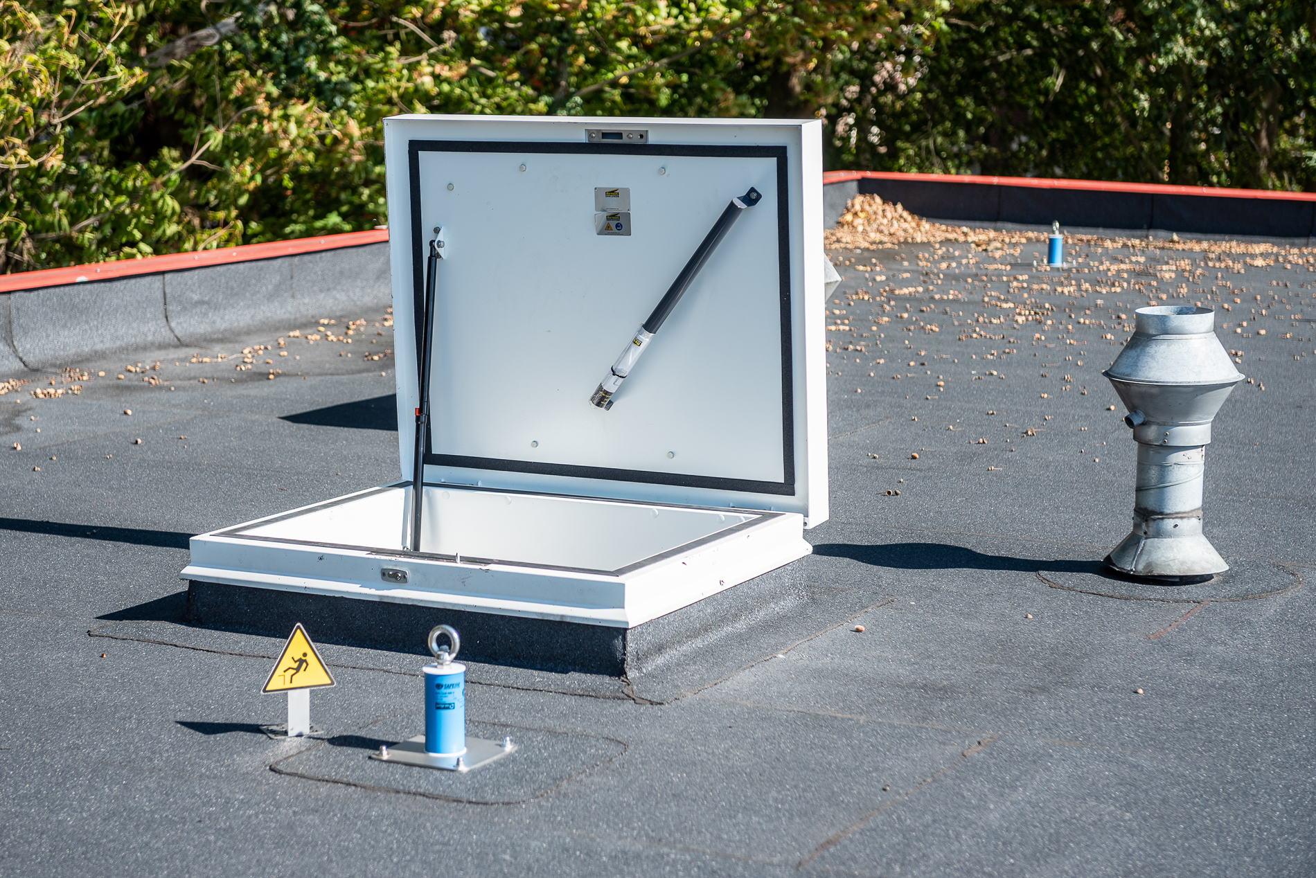 - Er is een groot dakluik gemaakt en deze is voorzien van een passende ladder met haken tegen het wegglijden.