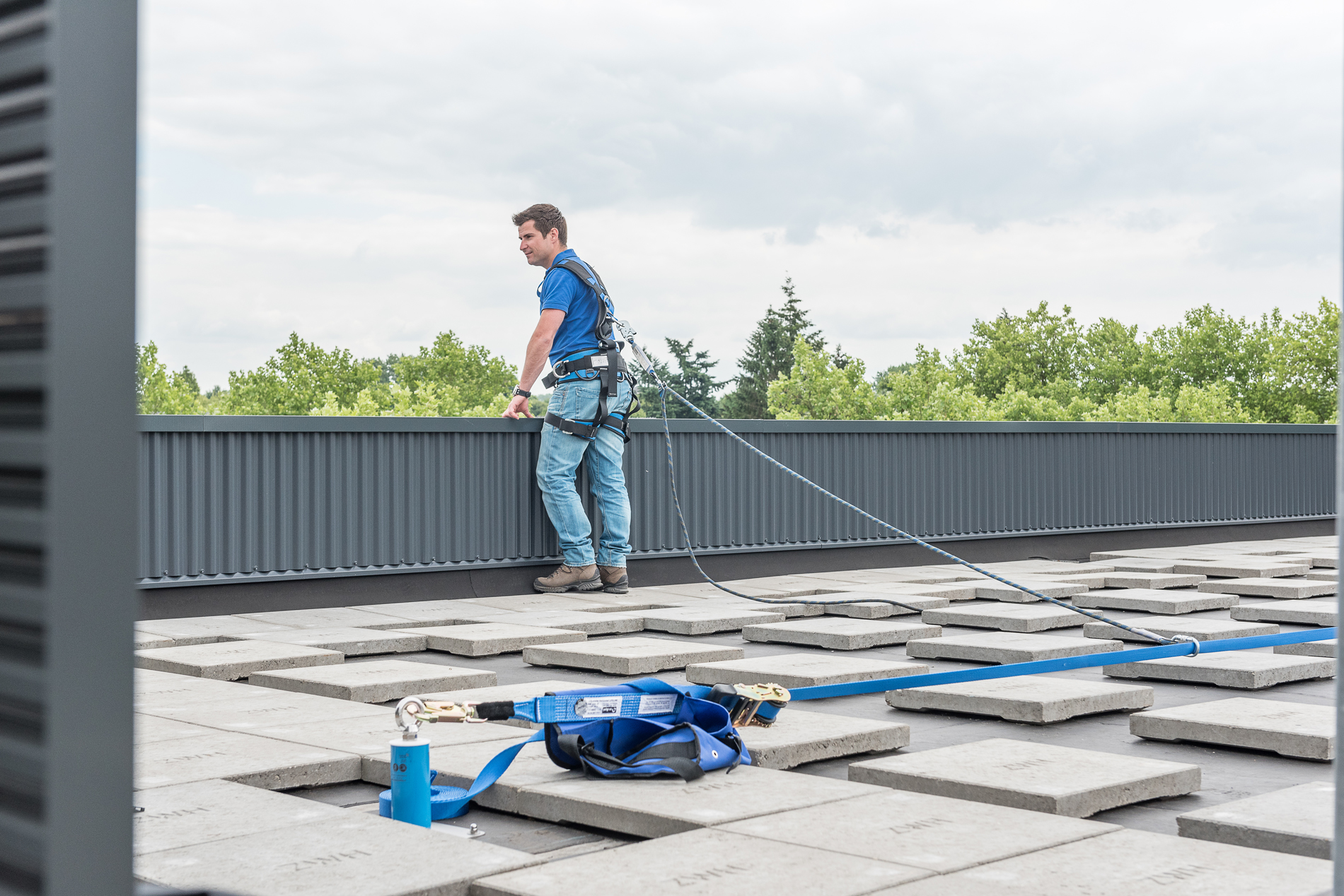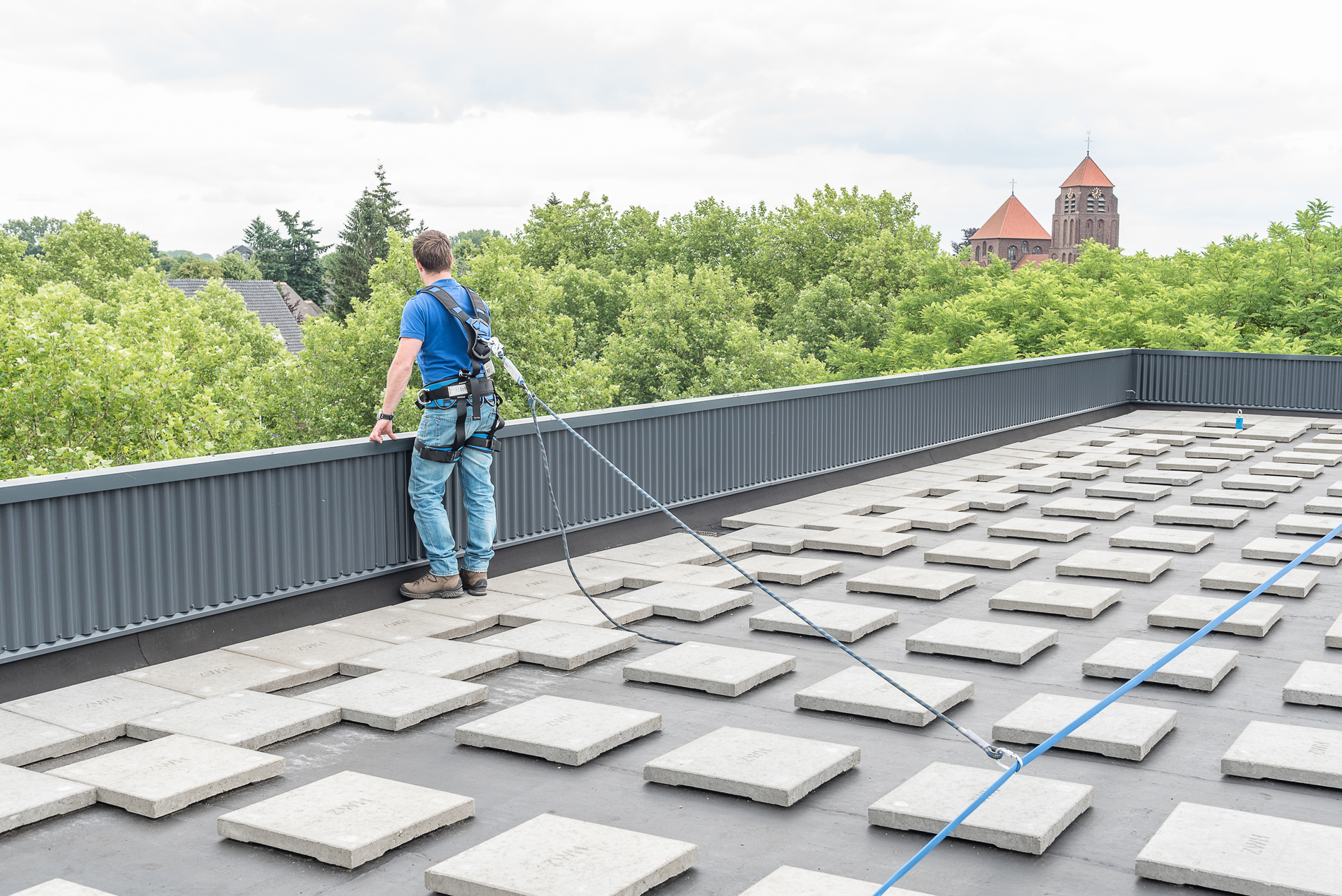 - Er is gekozen voor een SafeLine mobiel lijnsysteem conform EN795B met SafeLock EN795A anti pendule ankerpunten op de hoeken. Er mag met 3 personen tegelijk aan gewerkt worden.
