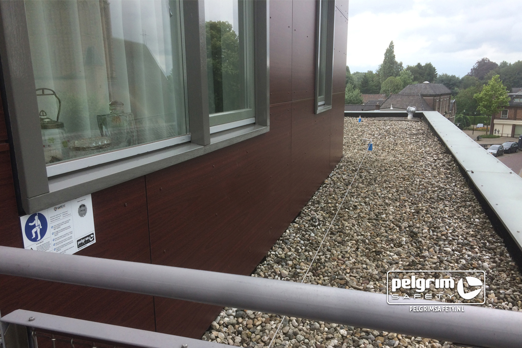 - Er is gekozen voor een SafeLine doorloopbaar lijnsysteem conform EN795C met SafeLock EN795A anti pendule ankerpunten op de hoeken. Er mag met 3 personen tegelijk aan gewerkt worden.