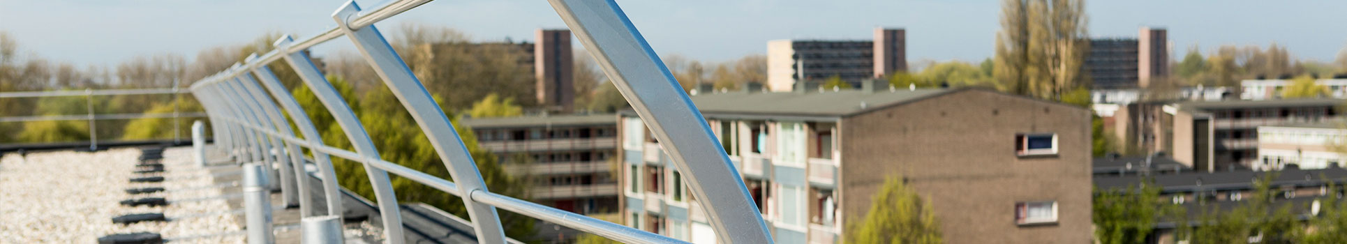 - Voor de collectieve valbeveiliging is gekozen voor een SafeRailing veiligheidshekwerk conform EN14122-3, hiermee is het toegestaan zonder PBM`s aan de dakrand te werken. Het bestaande dakluik is vervangen voor een groter dakluik. Deze opent licht met gascilinders en biedt een riante in- en uitstap. De toegang naar het dakluik is voorzien van een passende ladder met haken tegen het wegglijden. Om het zijdelingse valgevaar te voorkomen is er een afscherming bij het trappengat geplaatst. Deze afscherming is geheel in de stijl van de bestaande balustrade en in een bijpassende kleur gepoedercoat. Het afschermende hekwerk is conform het geldend bouwbesluit gemaakt.